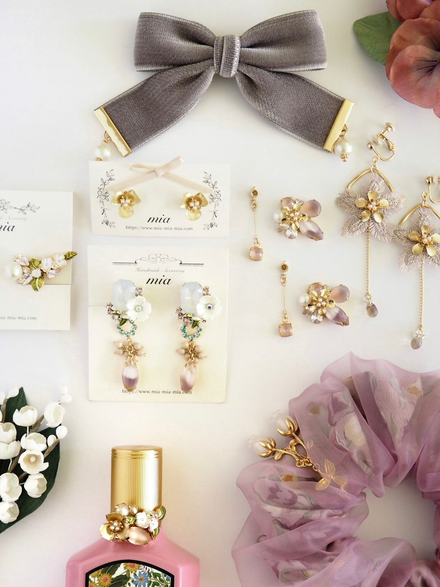ヴィンテージビジューやクリスタルを使用し、色合いや素材感にもこだわりました。