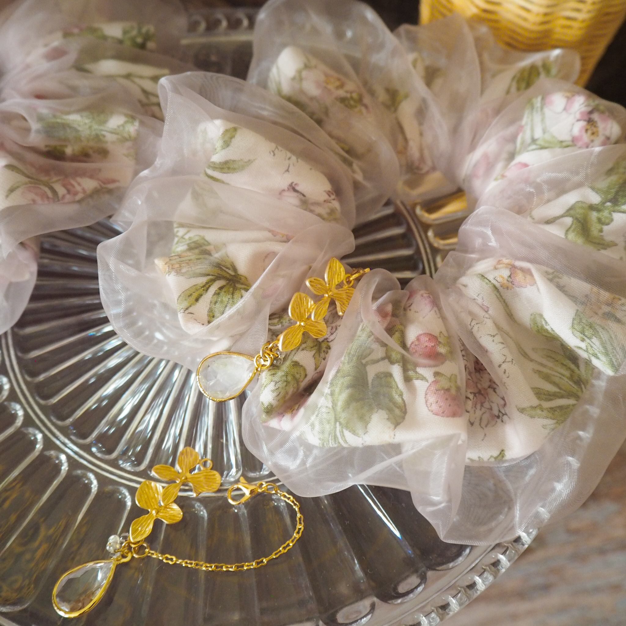☆オーガンジーの透け感と柄を楽しめるシュシュ。