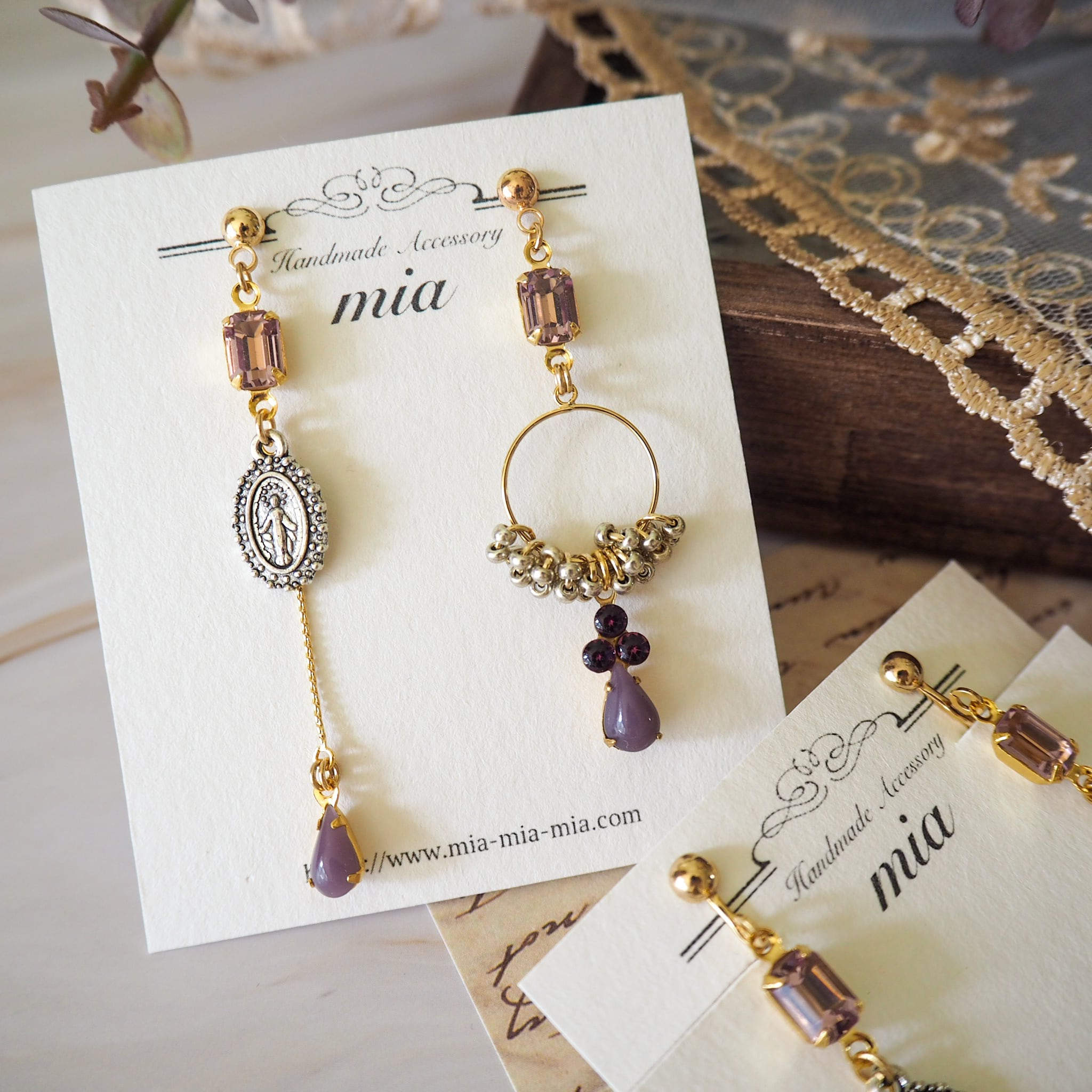 時を経てなお美しい輝きを放つ年代物のガラスストーンを主役に、左右異なるデザインで組み合わせたアシンメトリーシリーズ。
