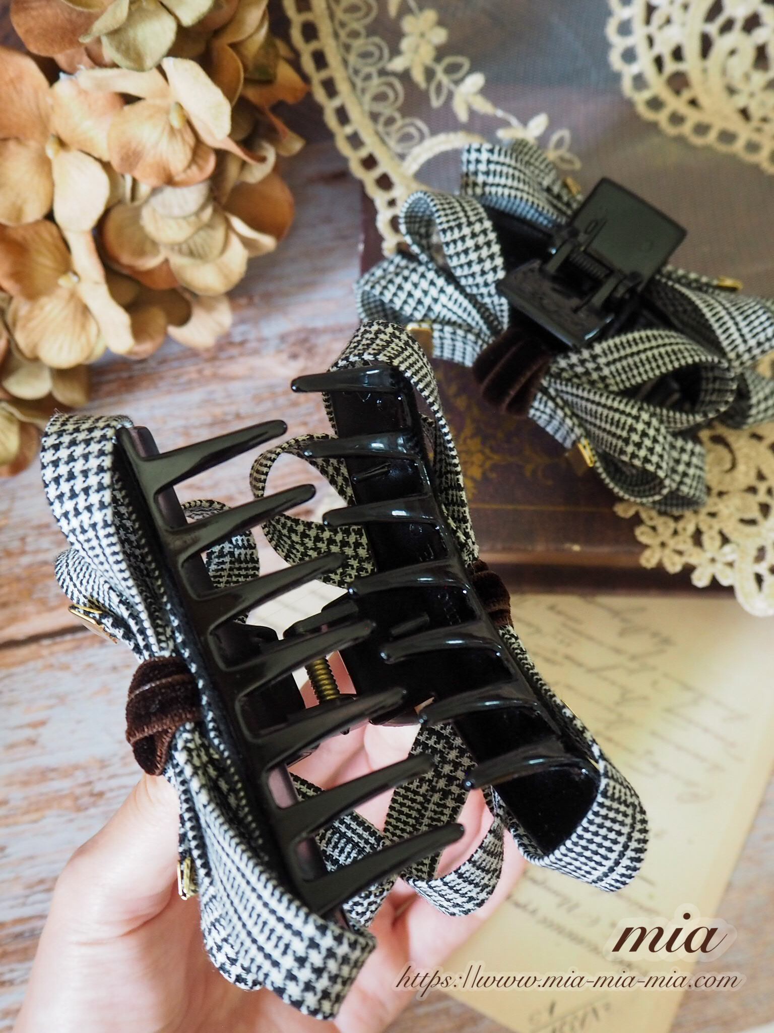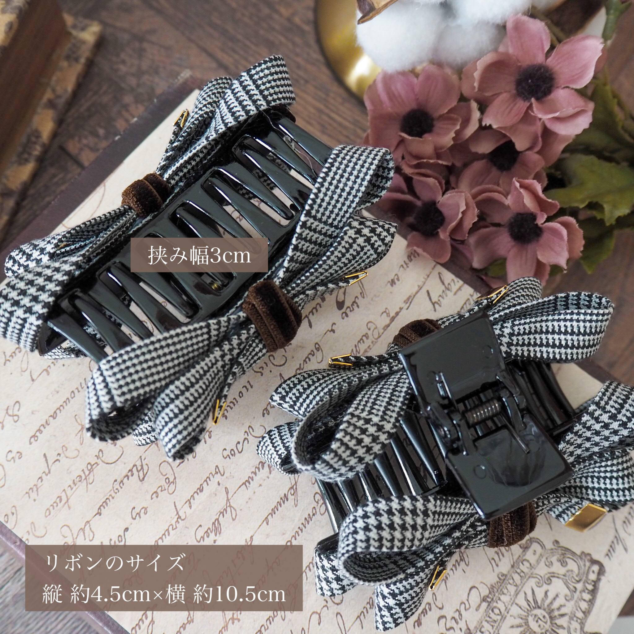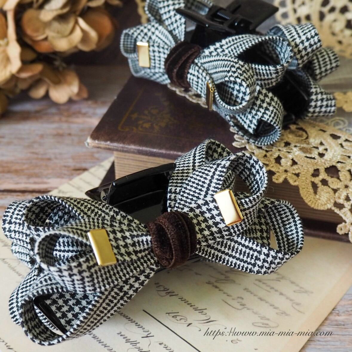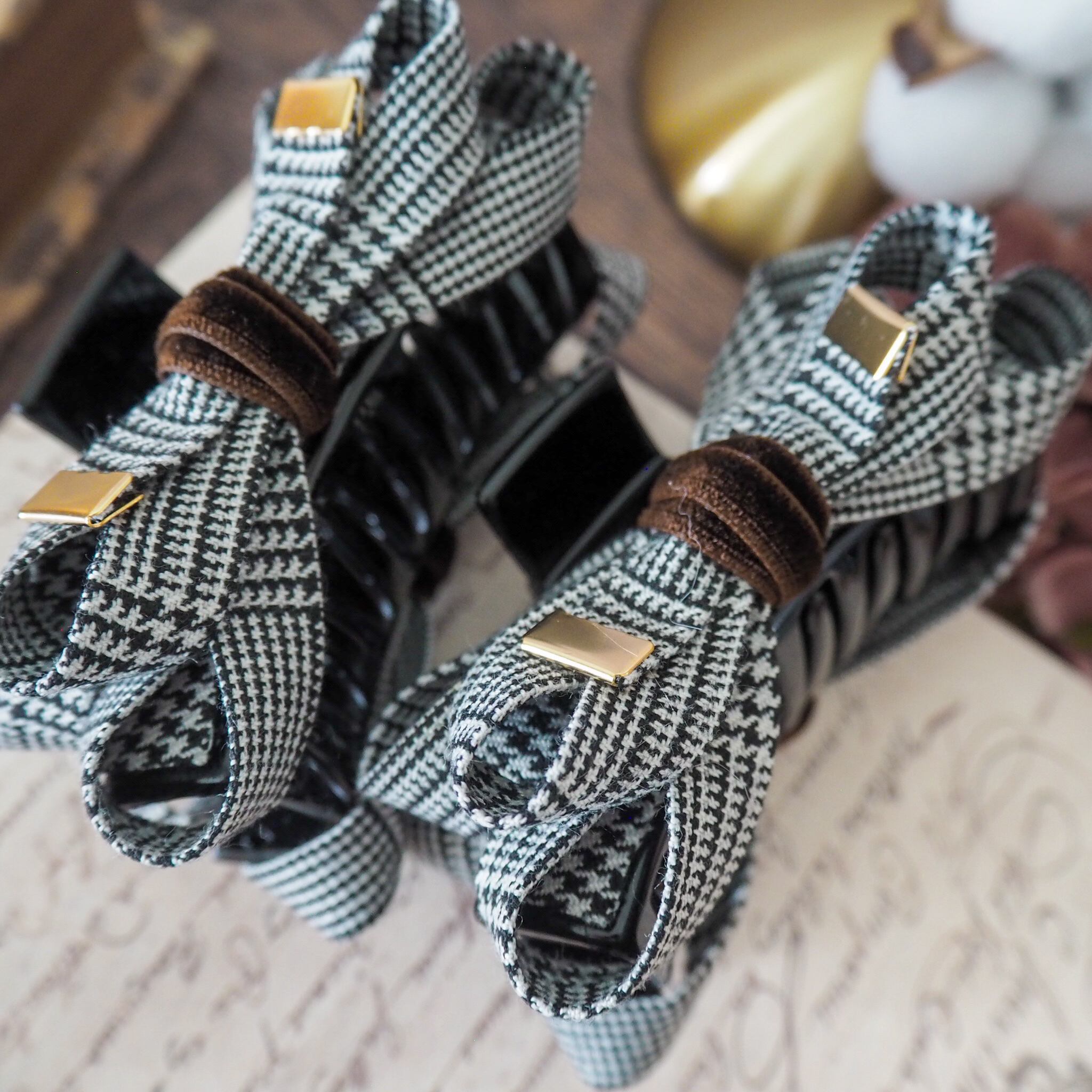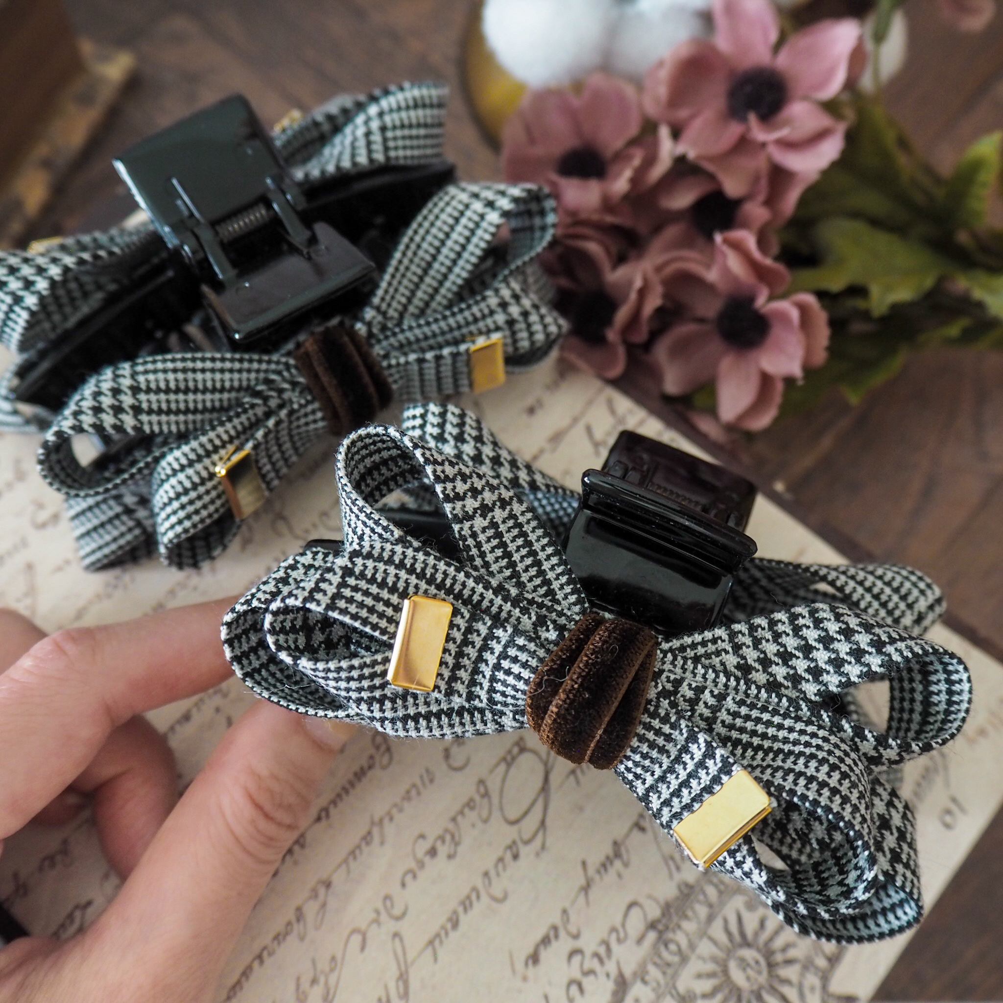 クラシカルなグレンチェック布を細リボン状に加工し重ね合わせ、立体感とボリュームを持たせたバンスクリップ。