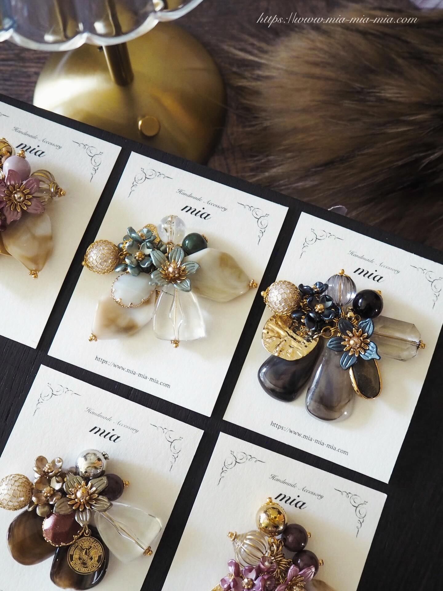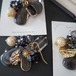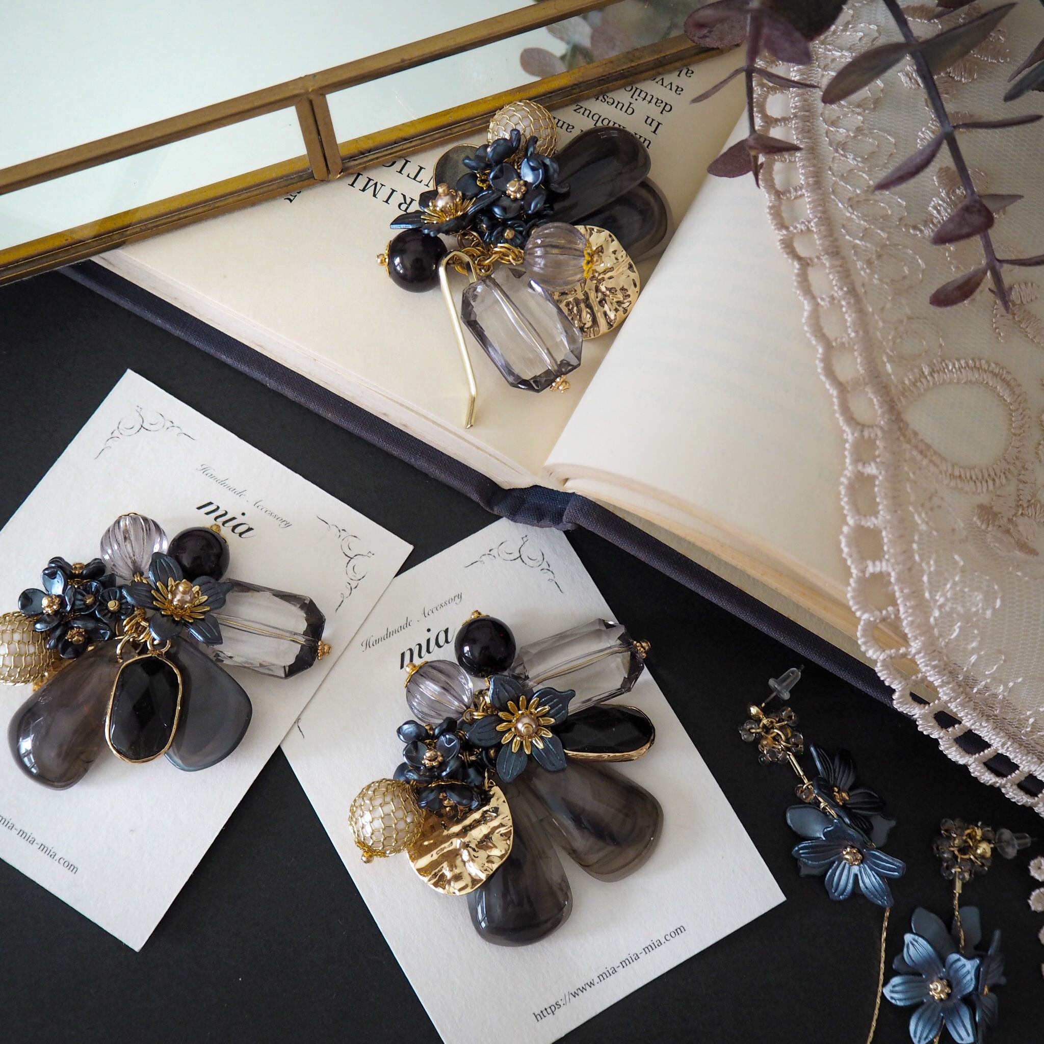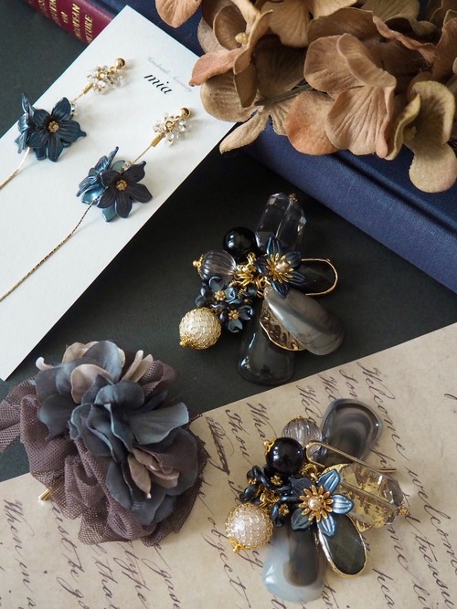 ブラックに染めたフラワーパーツを主役に天然石やビーズを組み合わせました。