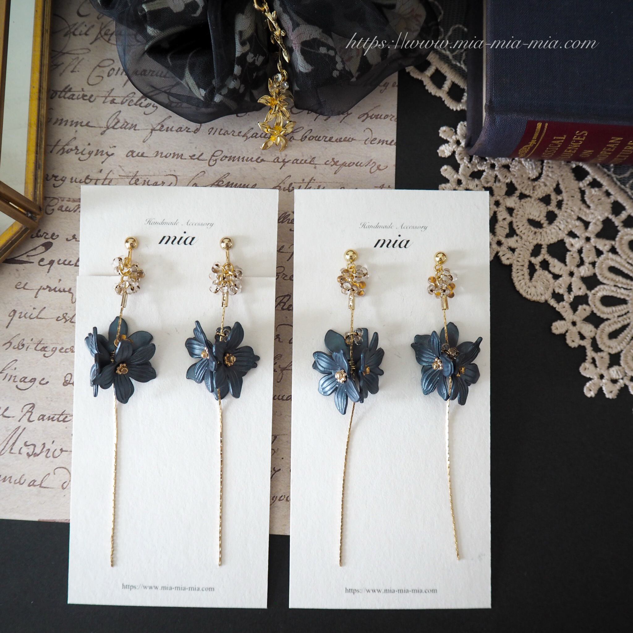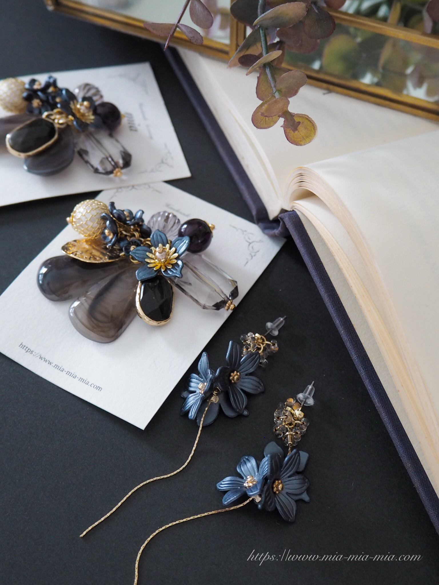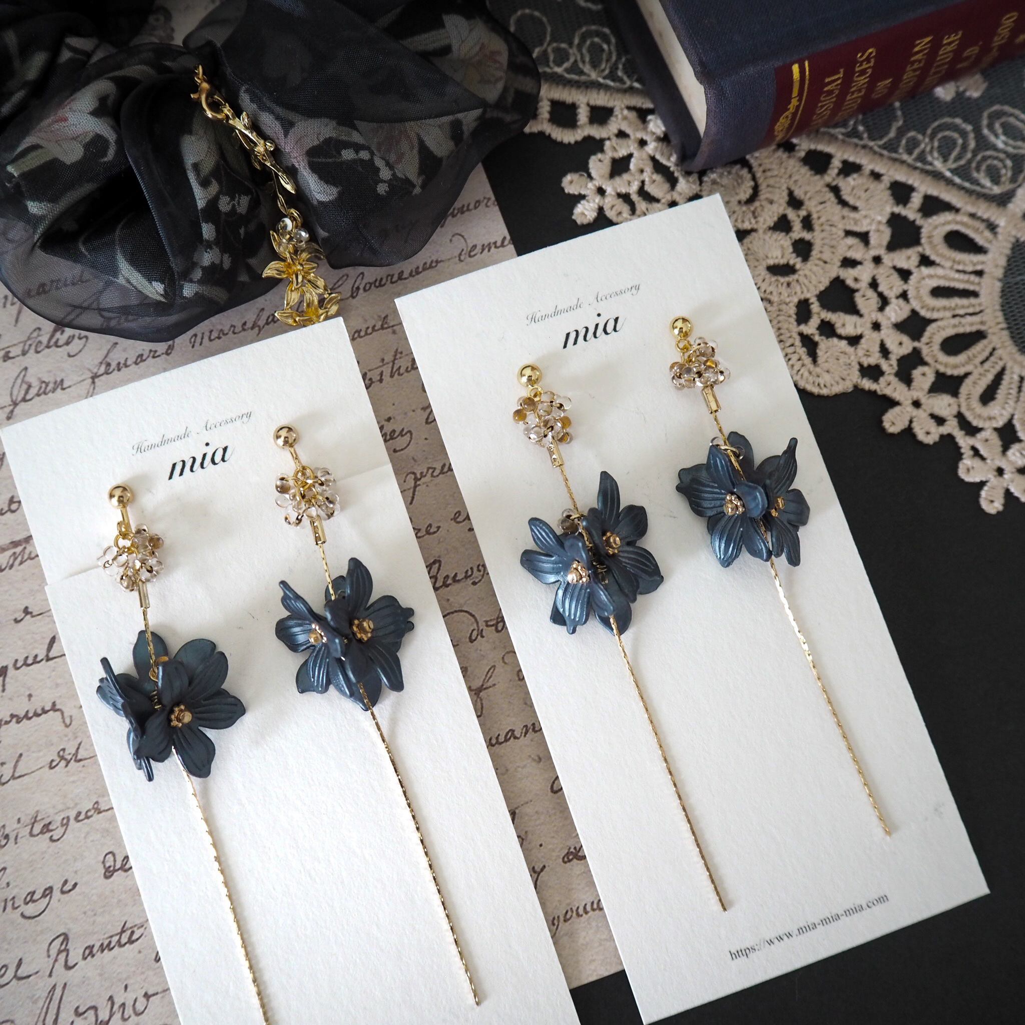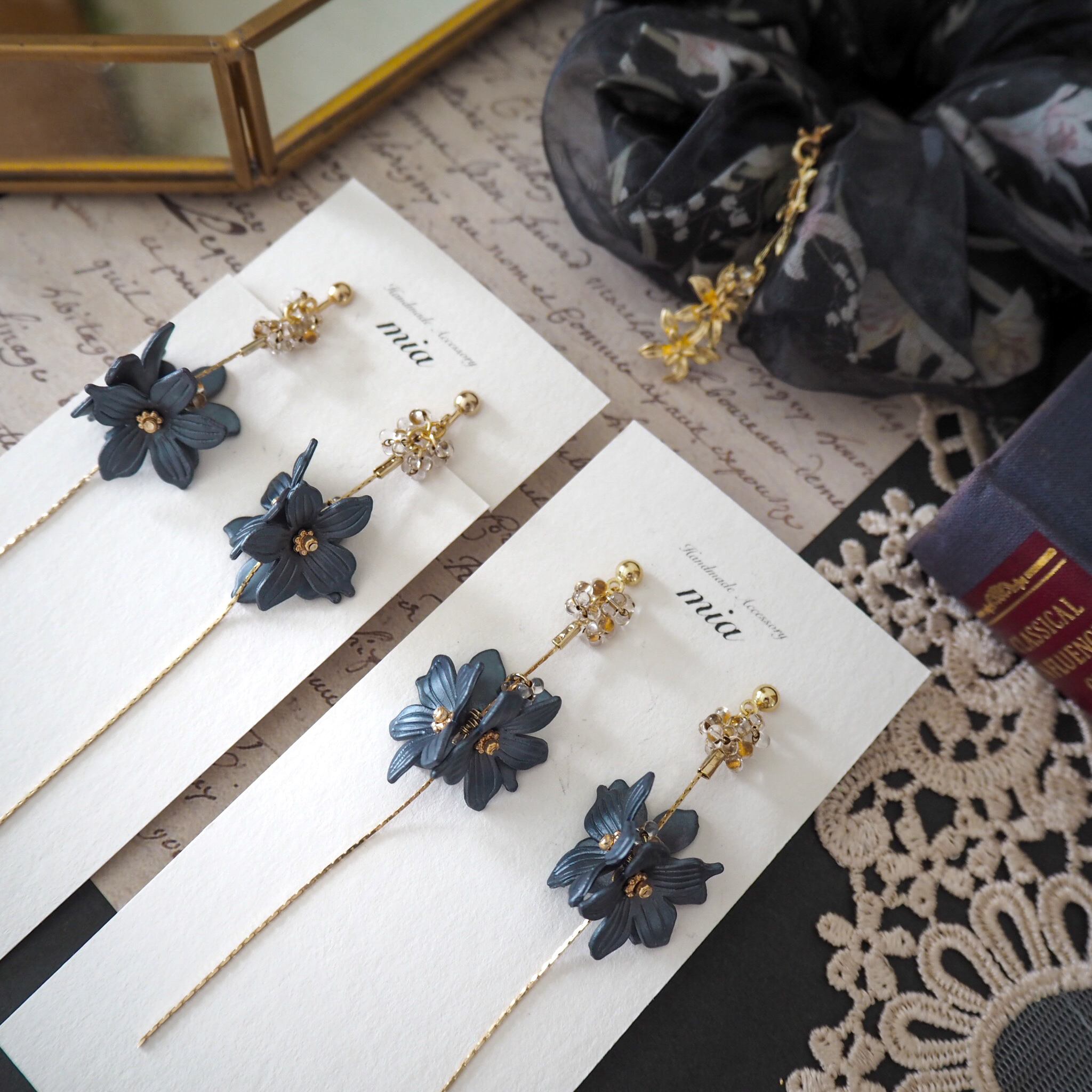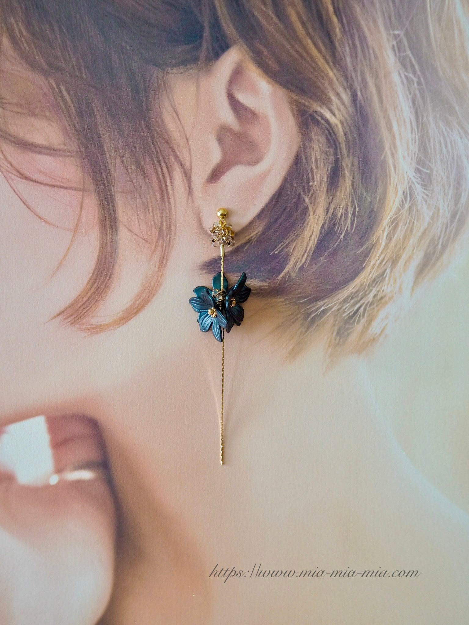 甘さのあるフラワーモチーフにスモーキーな色味を重ねた甘辛なピアスです。