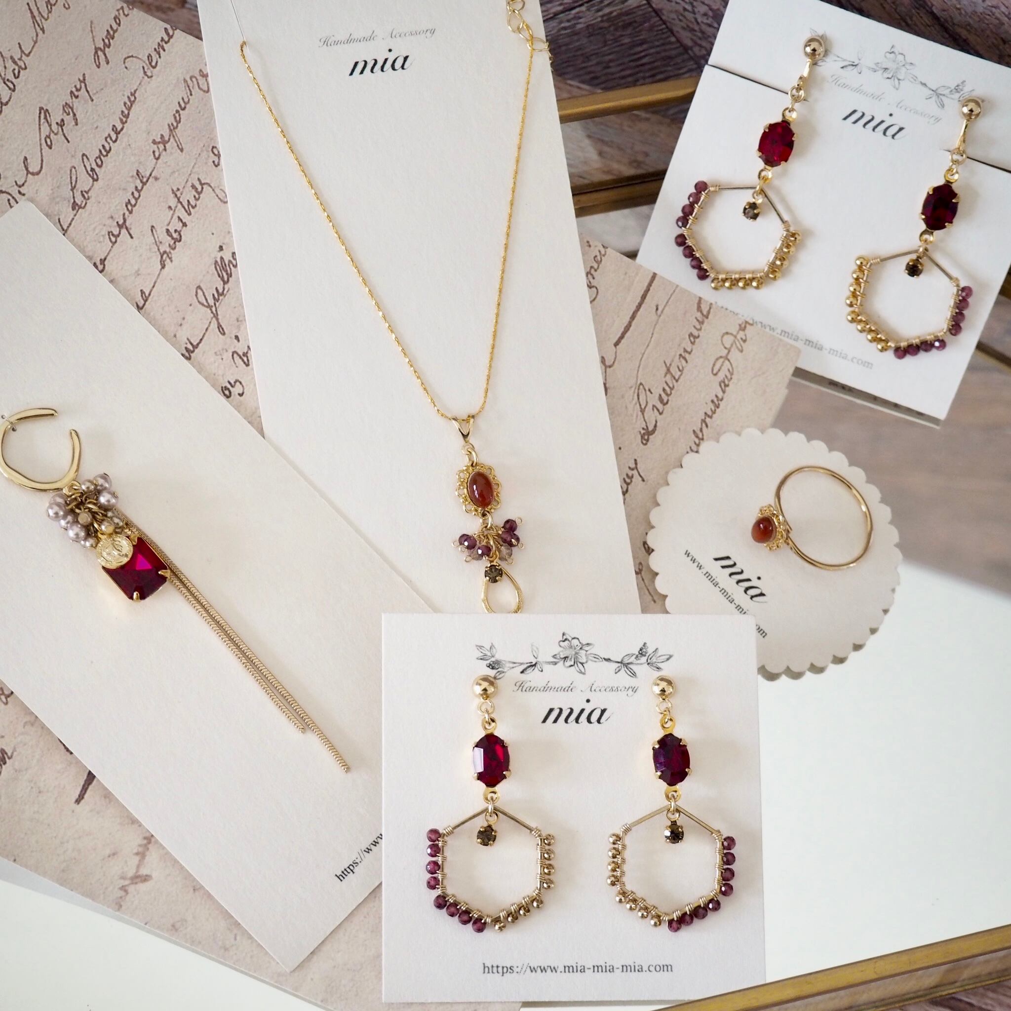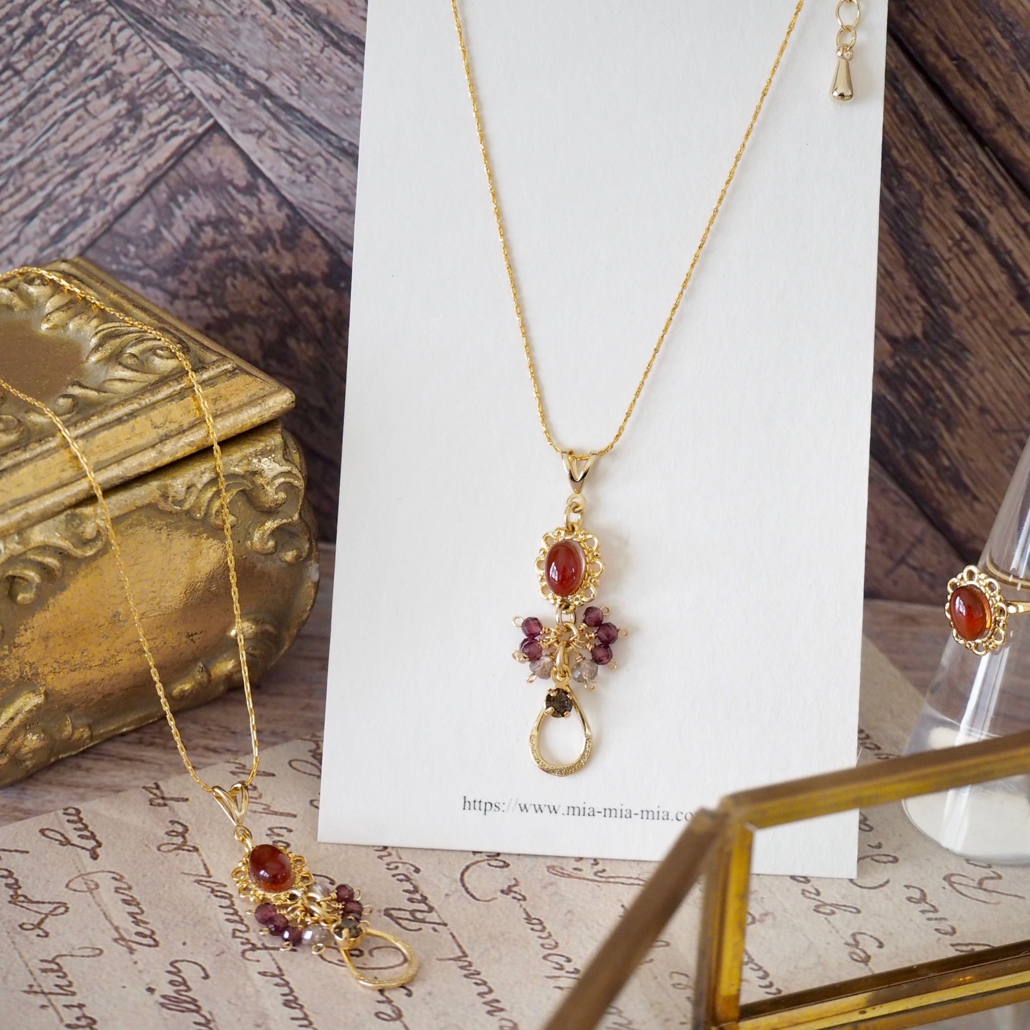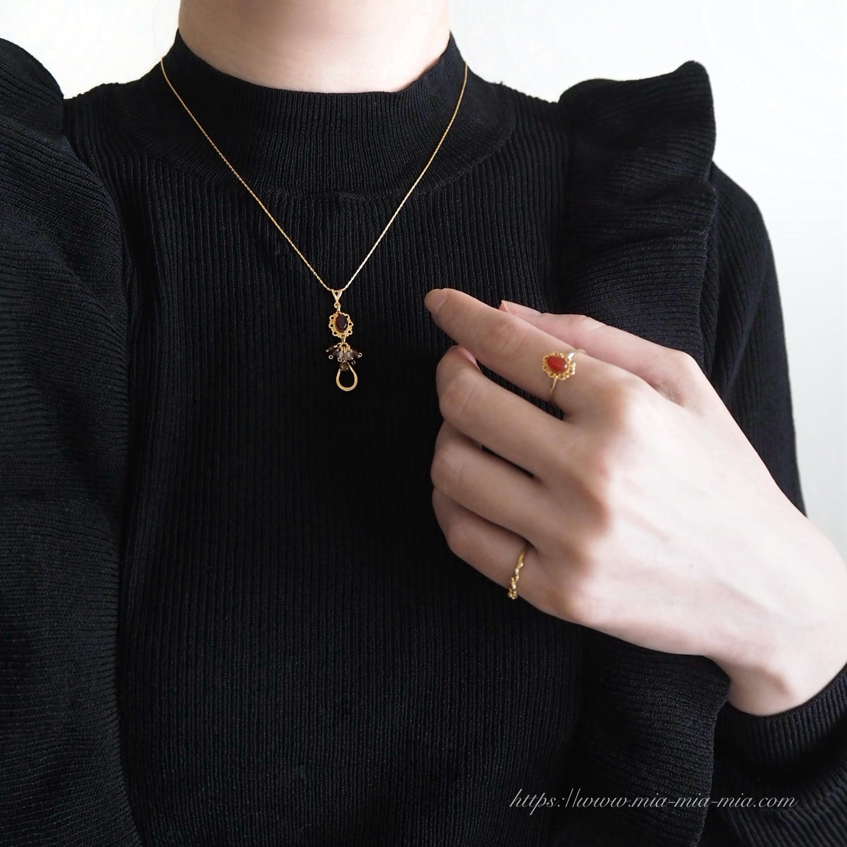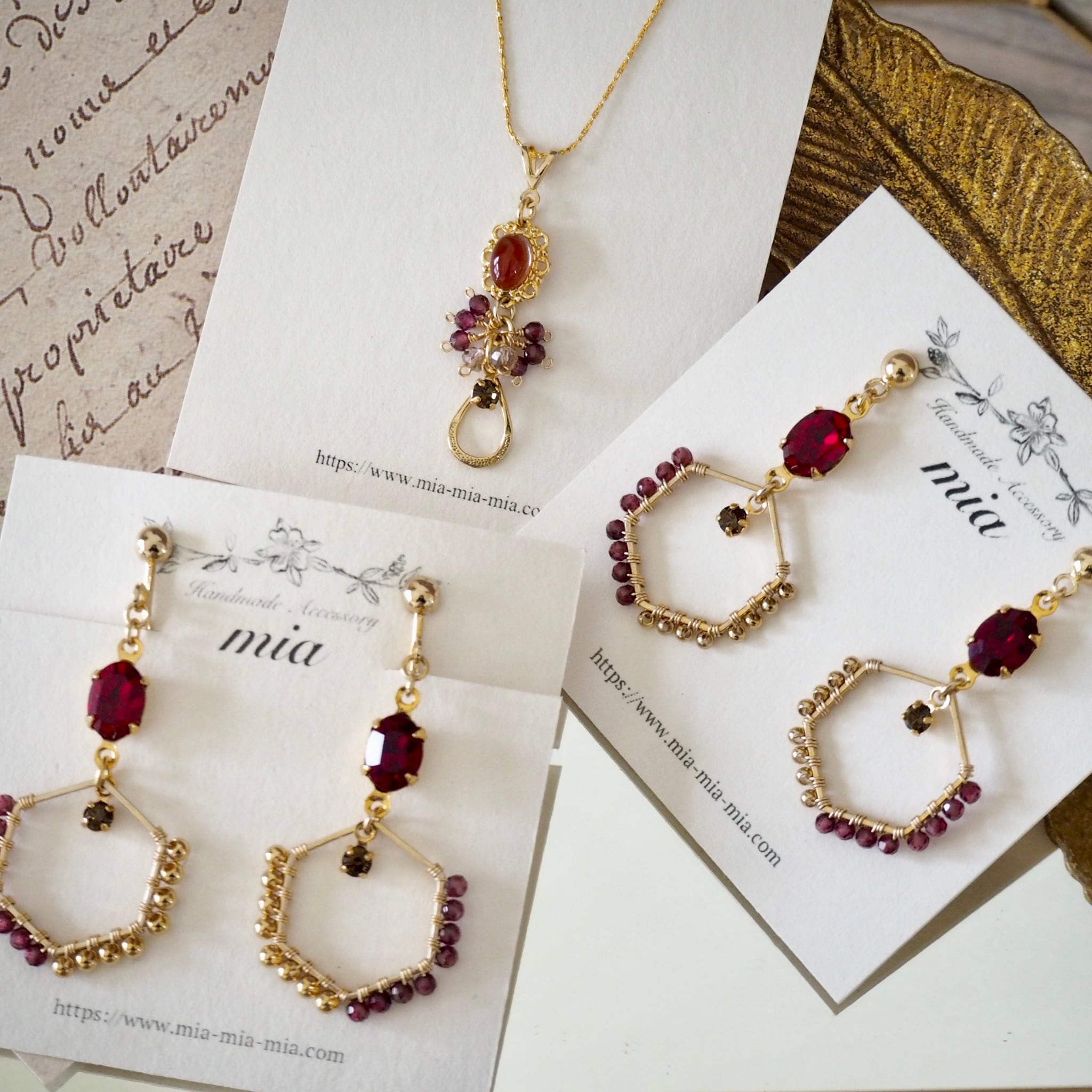 小粒のガーネットや繊細なメタルフレーム、チェーンを組み合わせることで