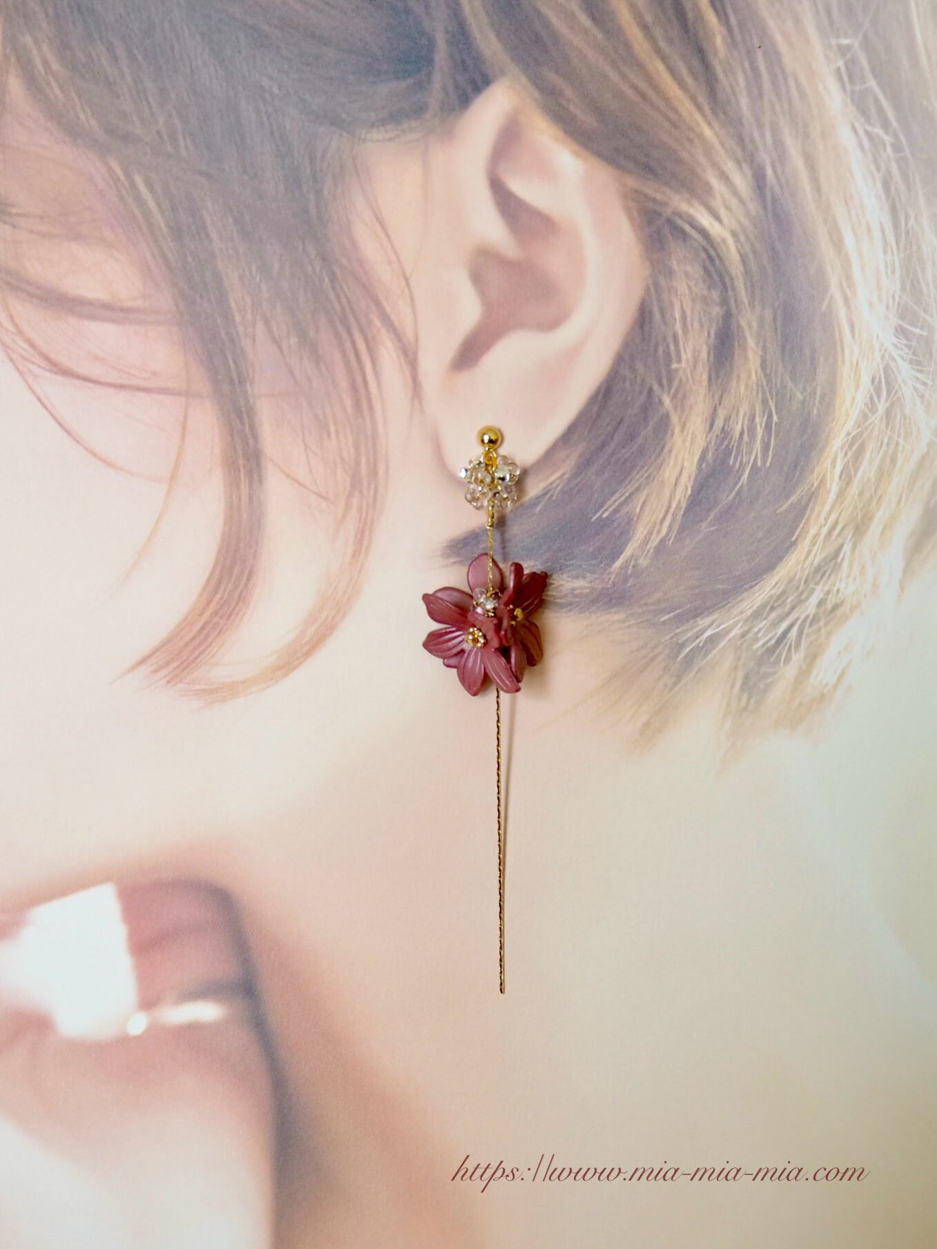 甘さのあるフラワーモチーフにスモーキーな色味を重ねた甘辛なピアスです。