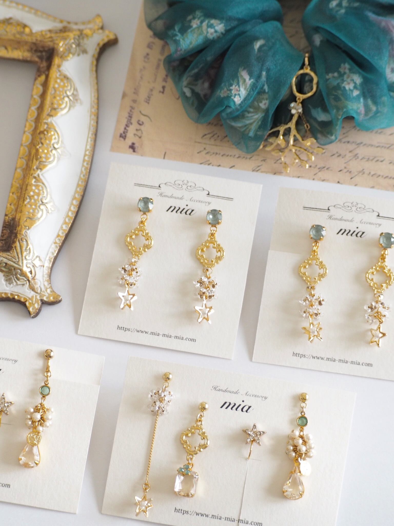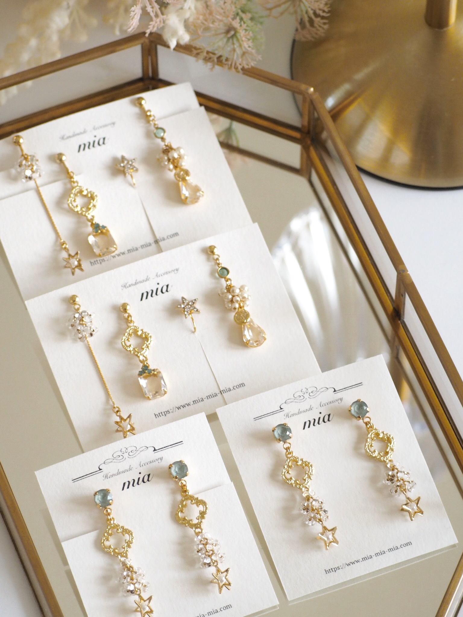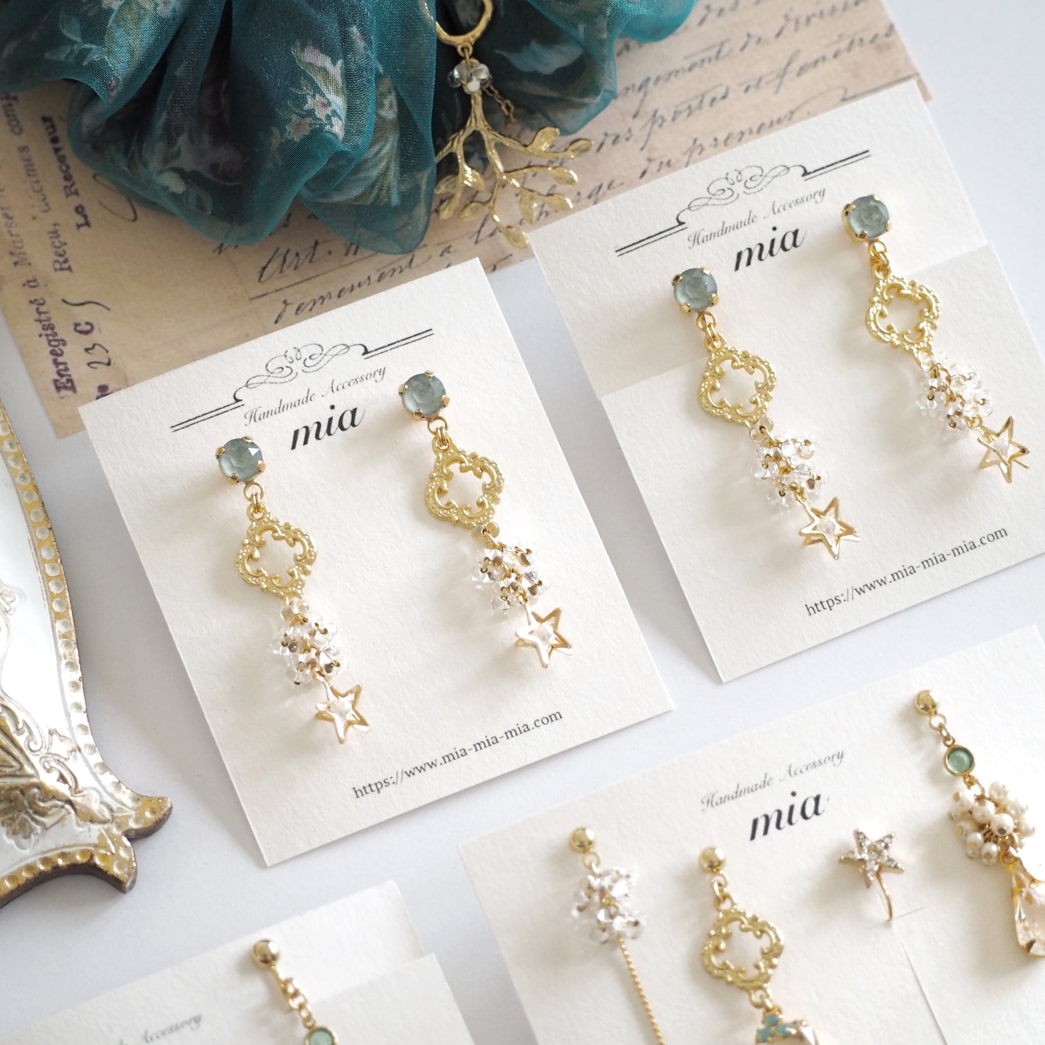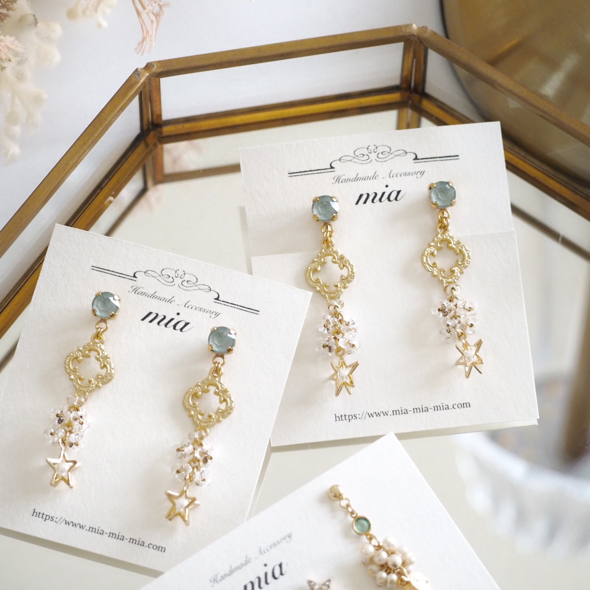 淡いグリーンのクリスタルストーンに、繊細な装飾パーツと星モチーフを重ねたピアス。