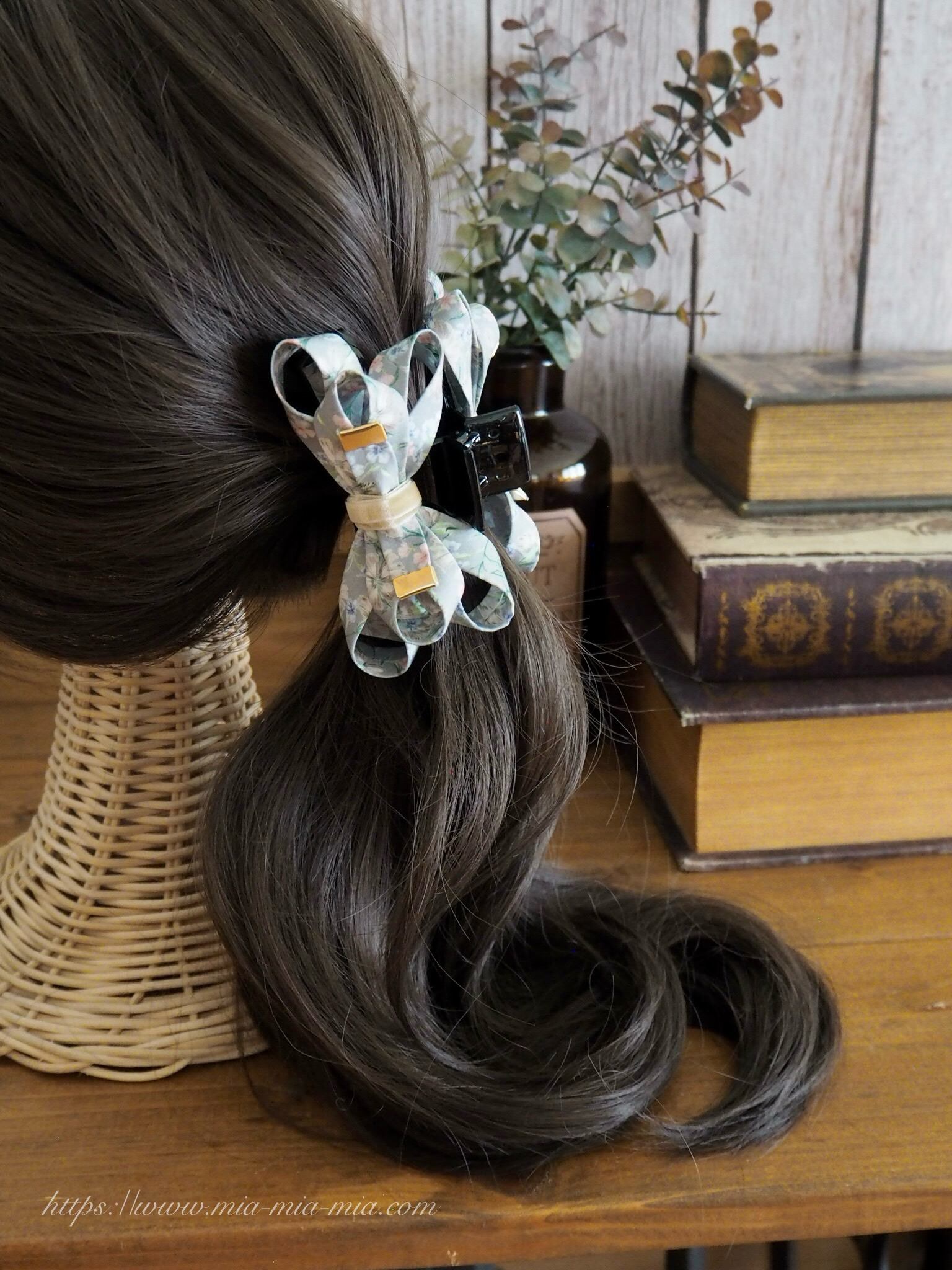 リバティプリント タナローン生地を細リボン状に加工し重ね合わせ、立体感とボリュームを持たせたバンスクリップ。