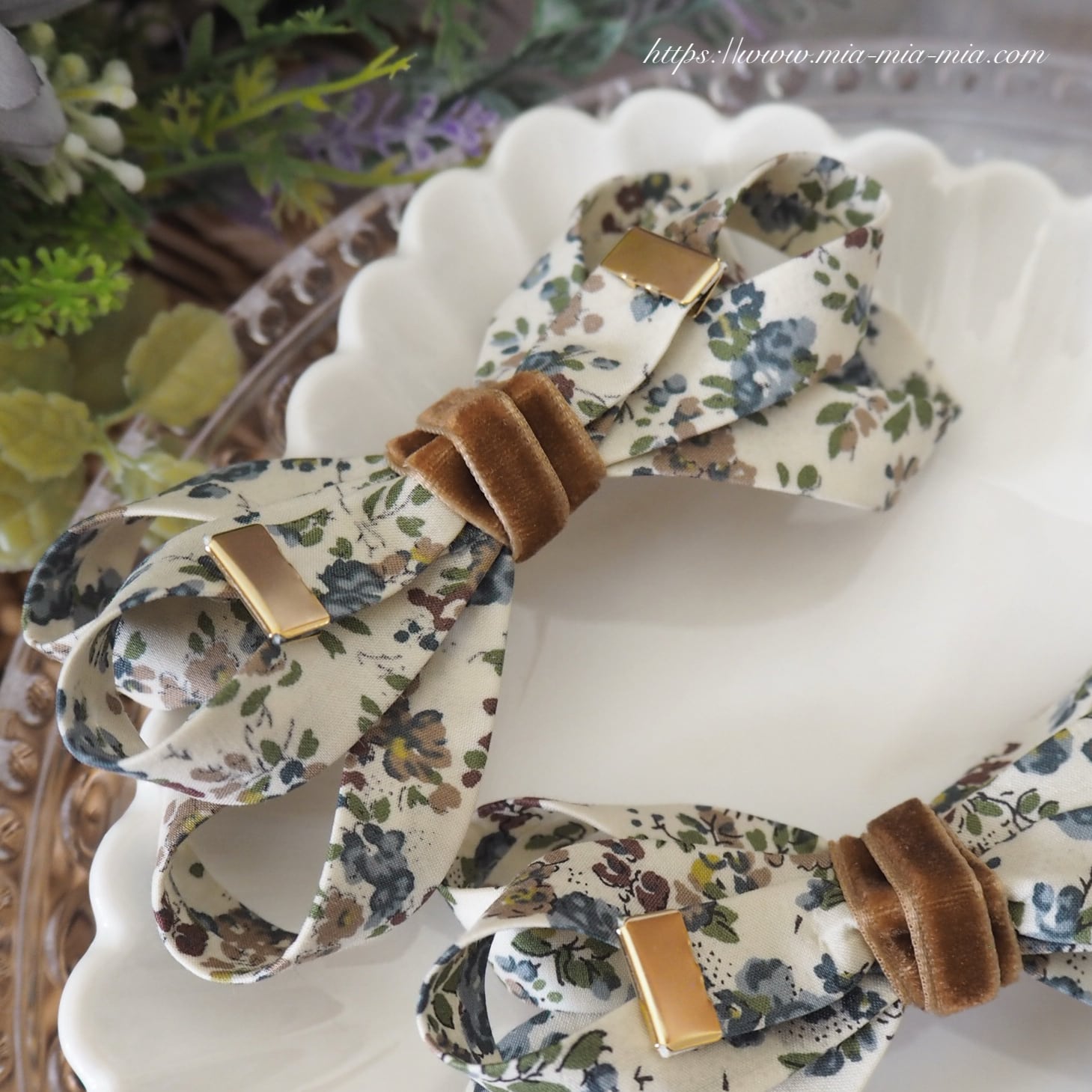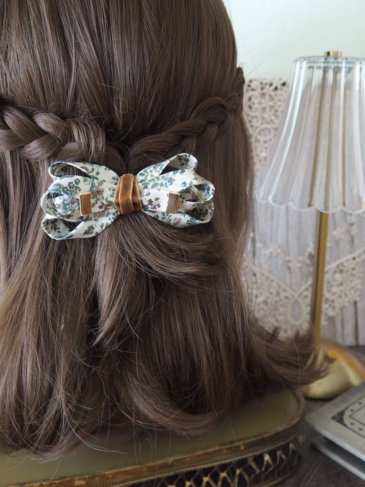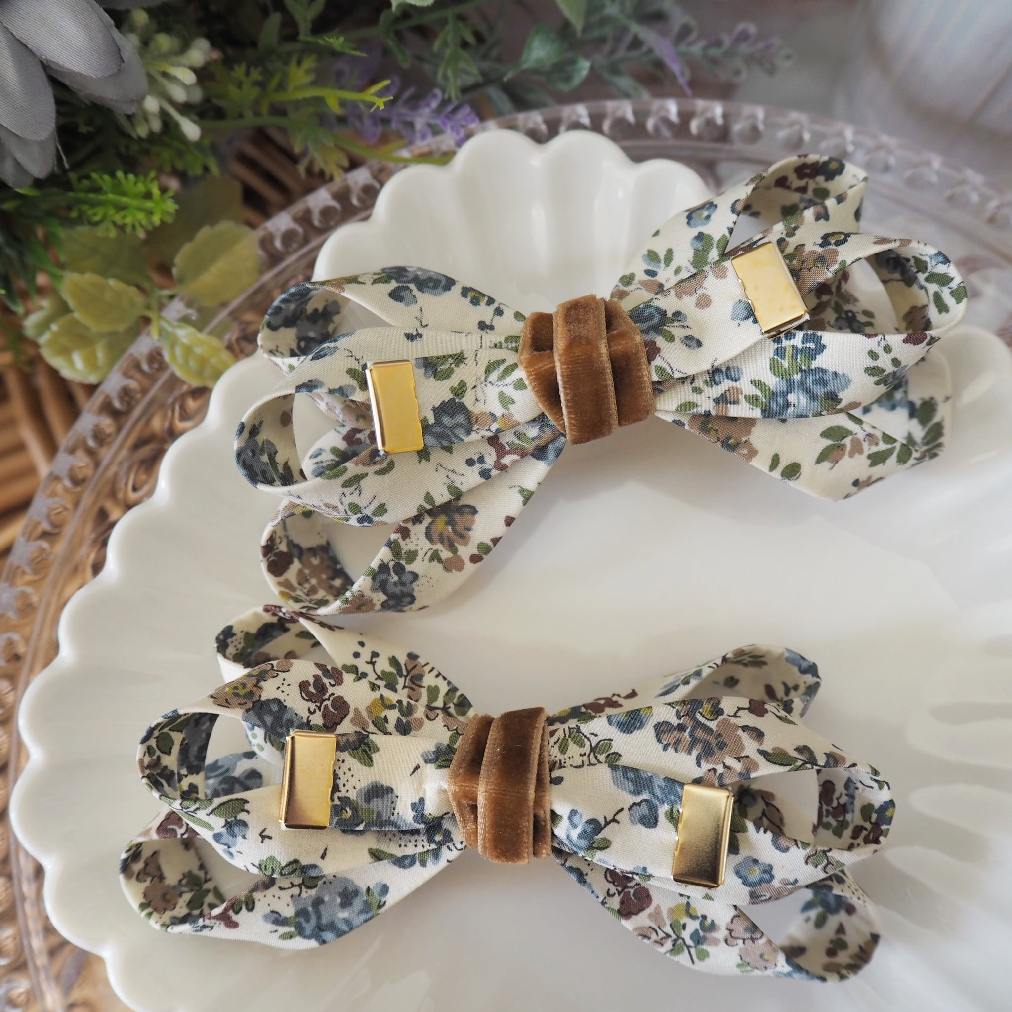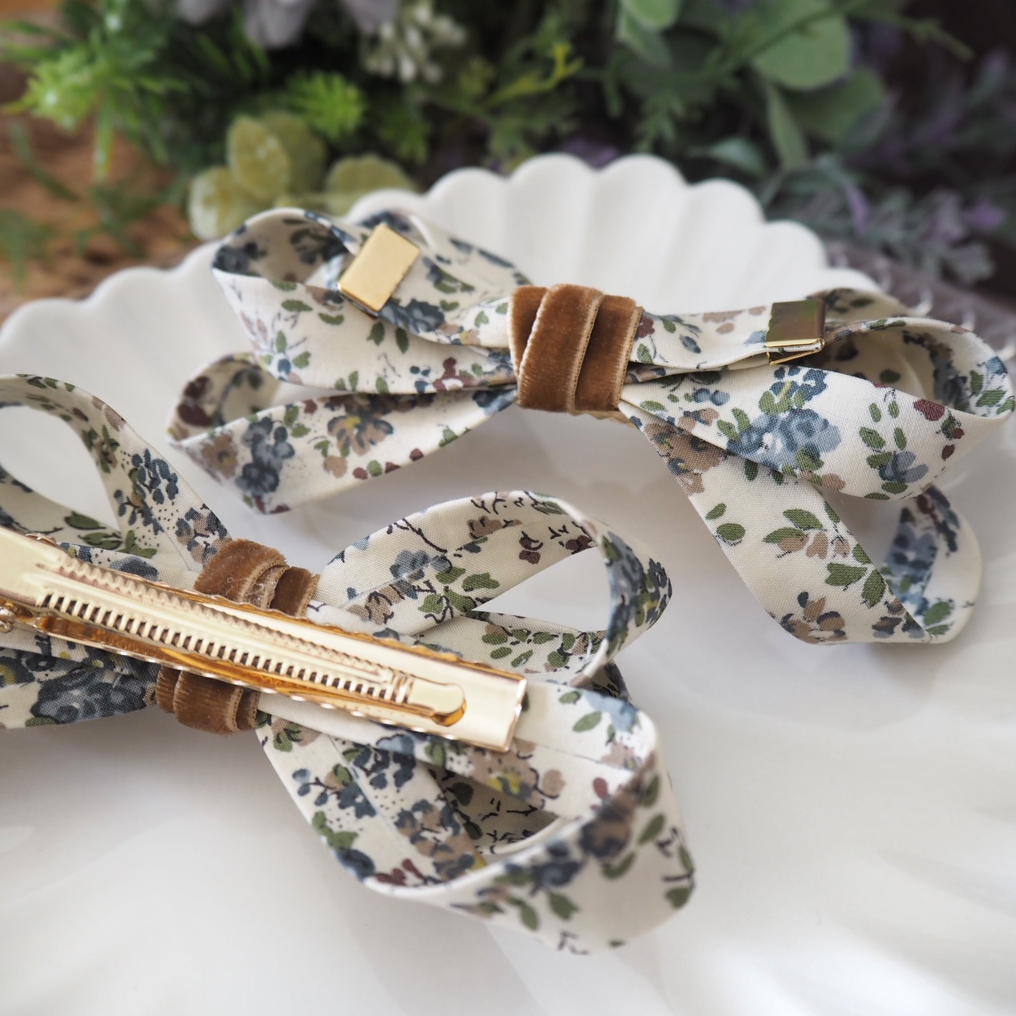 繊細な柄や鮮やかな色彩が特徴のリバティタナローン生地を使用し、世代を越えて長く愛用していただけるリボンクリップに仕立てました。
