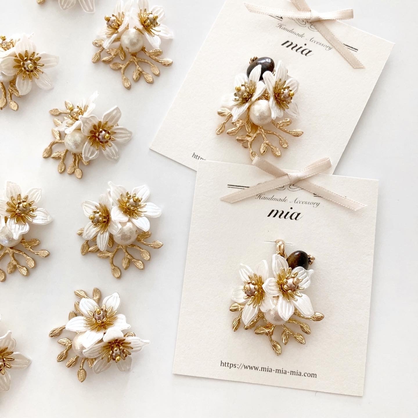 ☆ホワイトのお花にゴールドのリーフが映えるデザイン。コットンパールと天然石ブロンザイトを合わせ大人っぽさもプラスしました。