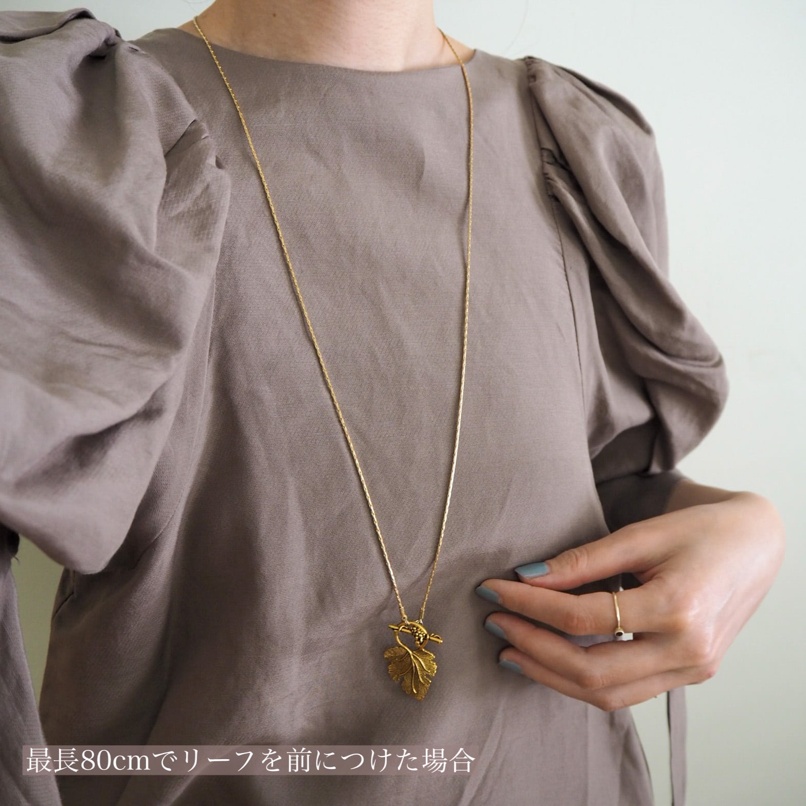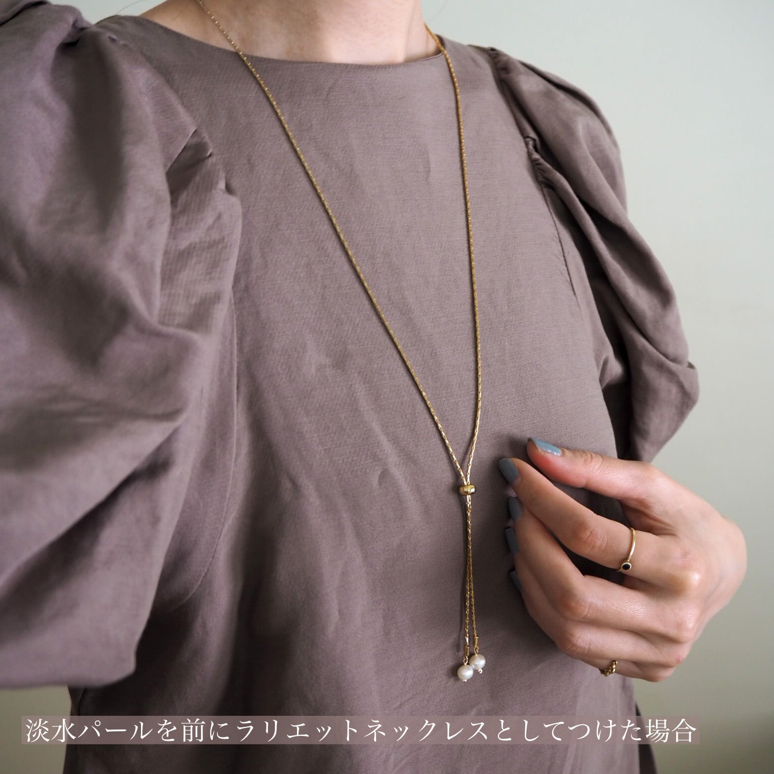 ・アンティークゴールドのリーフマンテルのネックレス、淡水パールが下がったラリエットネックレス、どちらを正面にしても使えるデザインです。