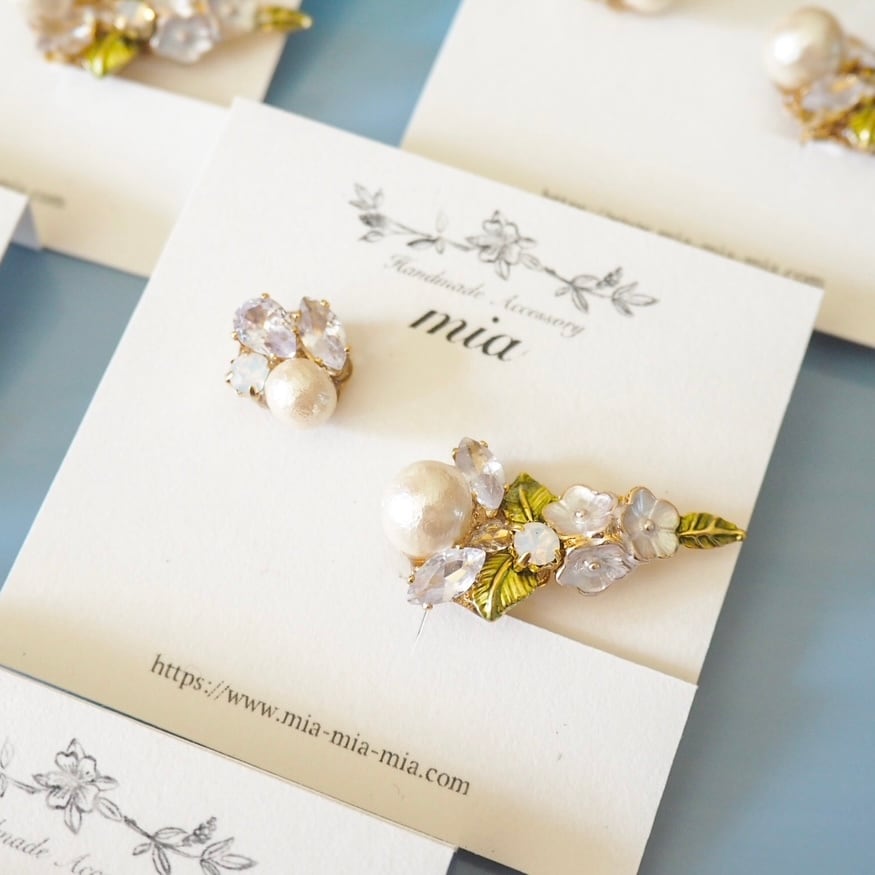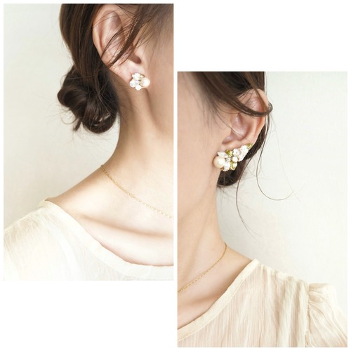 耳たぶに沿わせてつけられるバネクリップ加工のフラワーイヤークリップと、小ぶりなデザインのピアス・イヤリングのセットです。