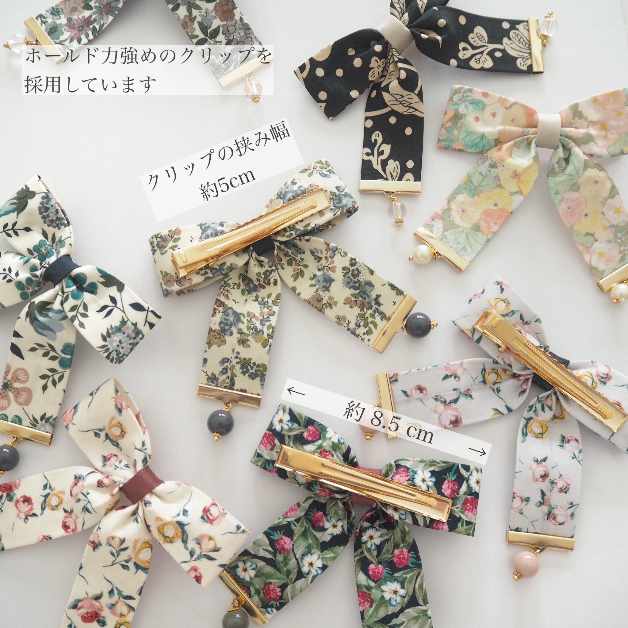 英国発ファブリックブランド・リバティ社のタナローン生地を使用し、25mm幅の両面リボンクリップに仕立てました。