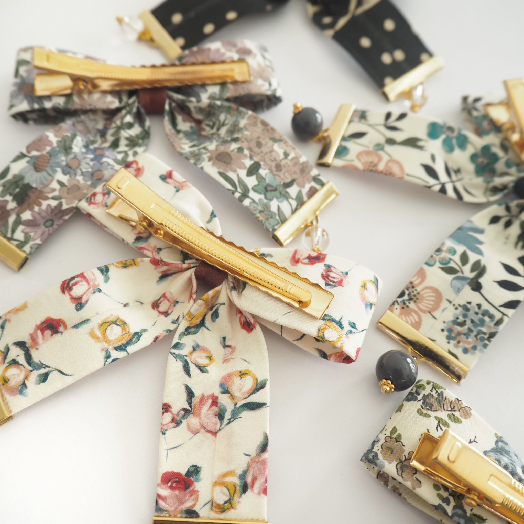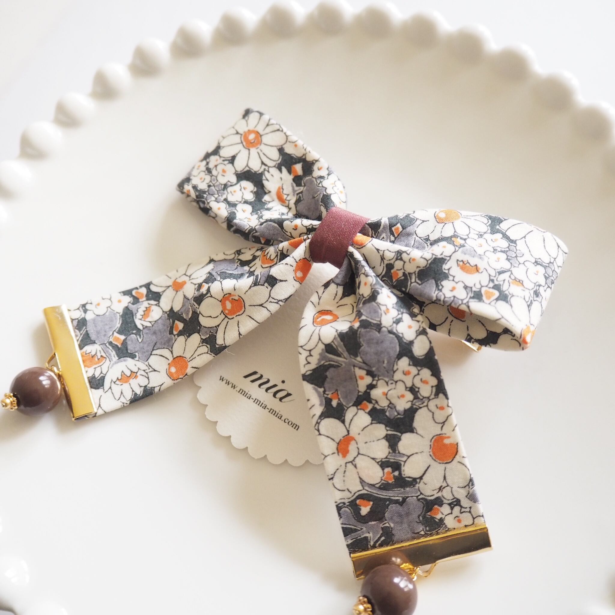 英国発ファブリックブランド・リバティ社のタナローン生地を使用し、25mm幅の両面リボンクリップに仕立てました。