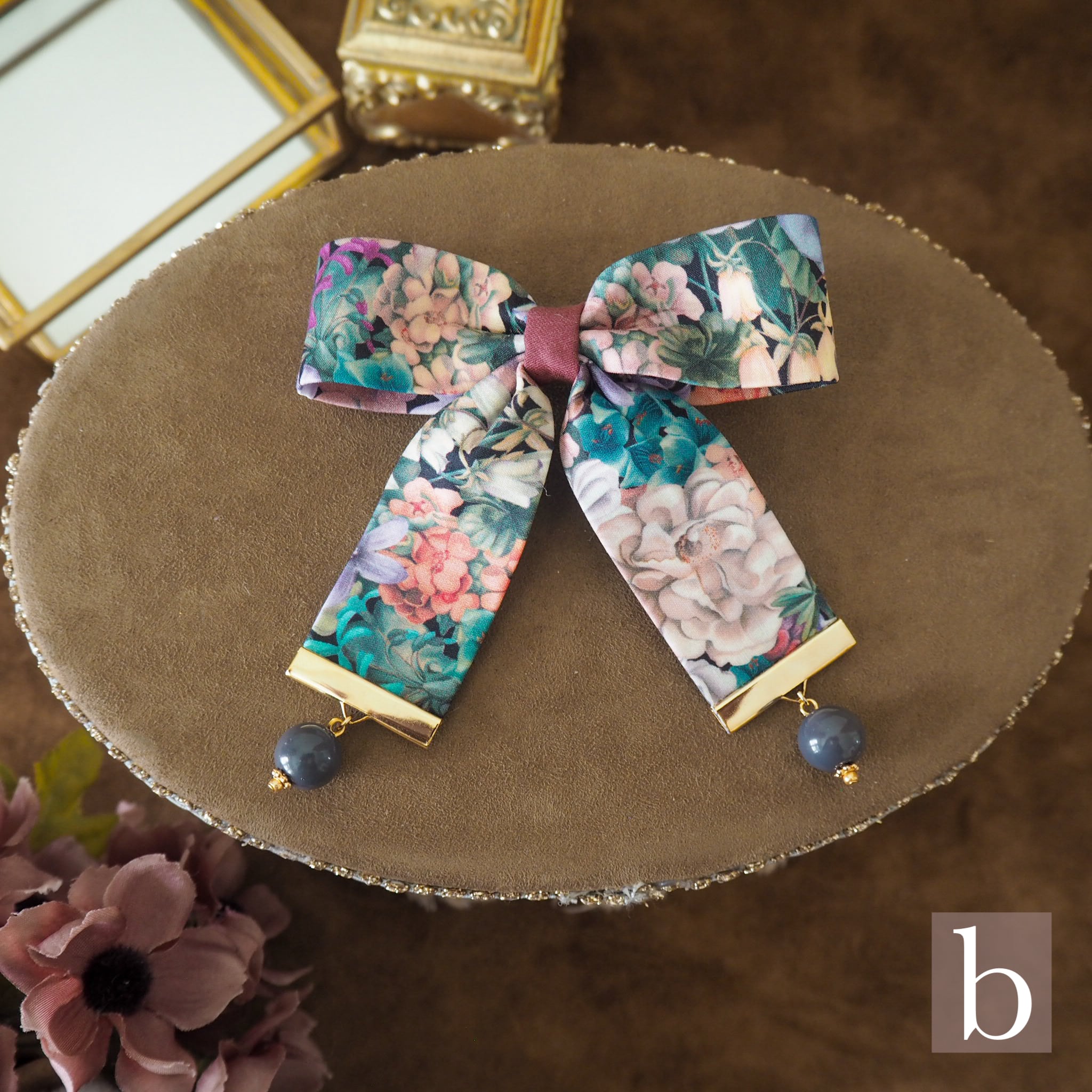 英国発ファブリックブランド・リバティ社のタナローン生地を使用し、25mm幅の両面リボンクリップに仕立てました。